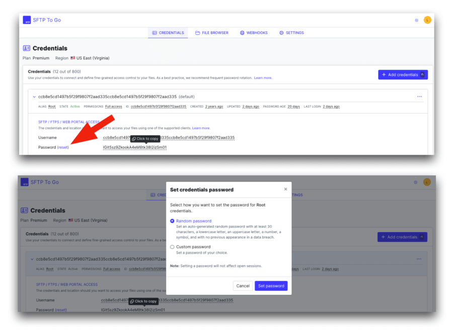 - Setting and rotating passwords: You can easily set or update passwords through the Credentials tab. Choose to either generate a random password, which adheres to your organization's security policy, or set a custom password.